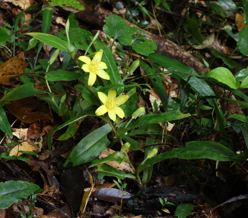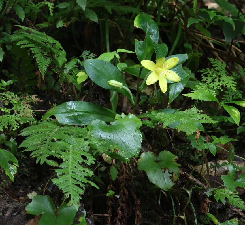 林床の腐葉土の中に根茎を下ろした個体。傍らにヘラシダやフユイチゴが見られる。この個体は茎の下部から上部まで葉や花がそろっており、葉腋につく花の様子がわかりやすい。
