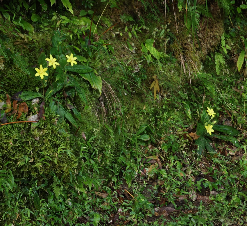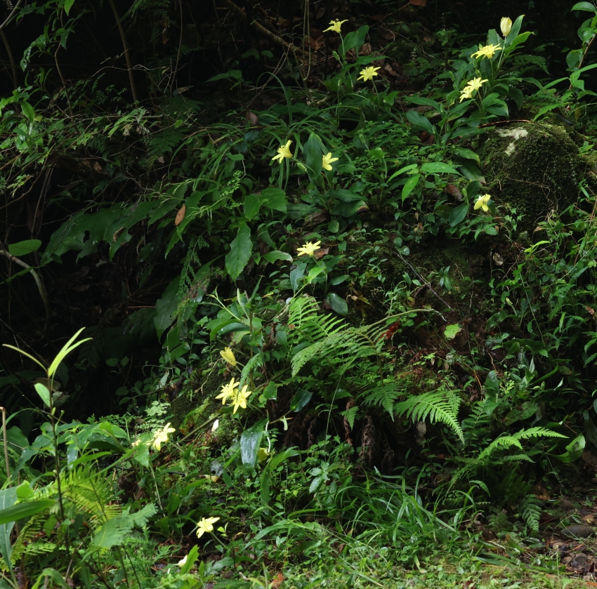 路傍の岩場に点在している個体。南北に展開する深い渓谷内であるため、明るい場所であっても日が差し込む時間は短い。キバナノホトトギスは明るい場所を好むようで、草丈も高くないため