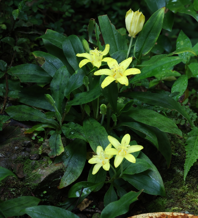 宮崎県だけのキバナノホトトギスに対してチャボホトトギスは紀伊半島や四国である。不思議なのは生育場所や草姿がよく似ているにもかかわらず、開花期間がキバナノホトトギスが雄性先熟の2日間、チャボホトトギスは雌雄同熟の1日だけということである。