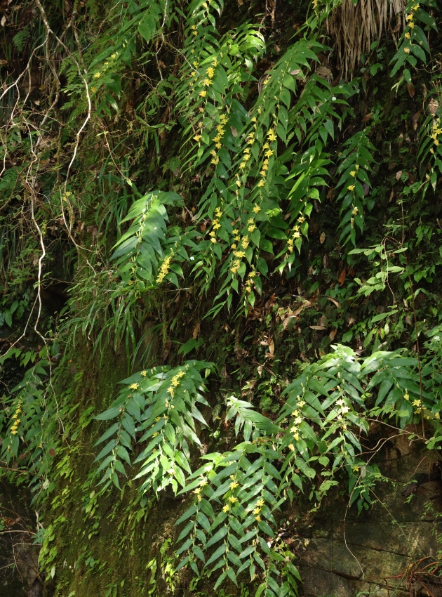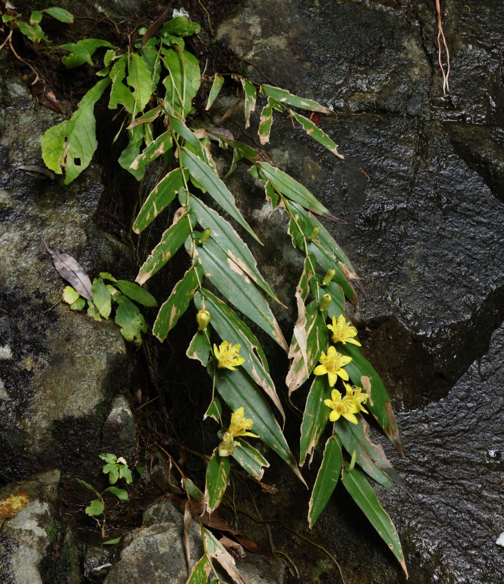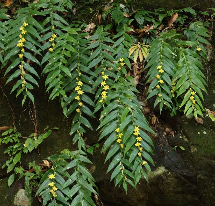 渓流の本流より30mほど高い崖地の小沢の岩壁に生育する個体。雨が降ると雨水が集まり小さな滝状になる急峻な岩場である。乾季は乾燥し、雨季は水に打たれる厳しい環境で葉は損傷が激しいが、たくましく花をつけ野性味たっぷりである。