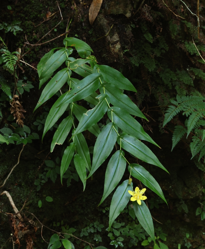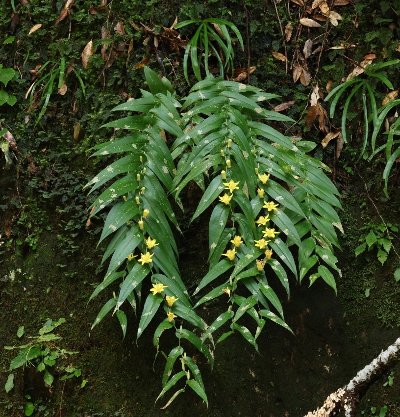 茎は50~70cmで、垂直に近い崖地の苔むした岩壁から垂れ下がっている。葉は互生し披針形で長さ8~17cm、茎は葉の基部で少し折れ曲がりながら直線状になる。上部には