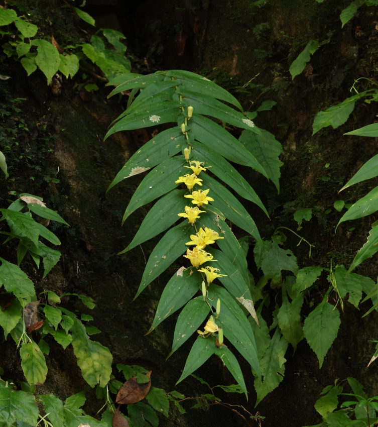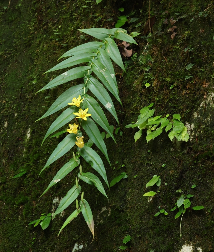 やや暗い垂直の岩壁に群生して生育する個体。開花していない葉だけの時期に見るとこのような暗い環境を好むシダ類と間違えそうであるが、開花すると黄色い花が暗い環境でよく目立ち、