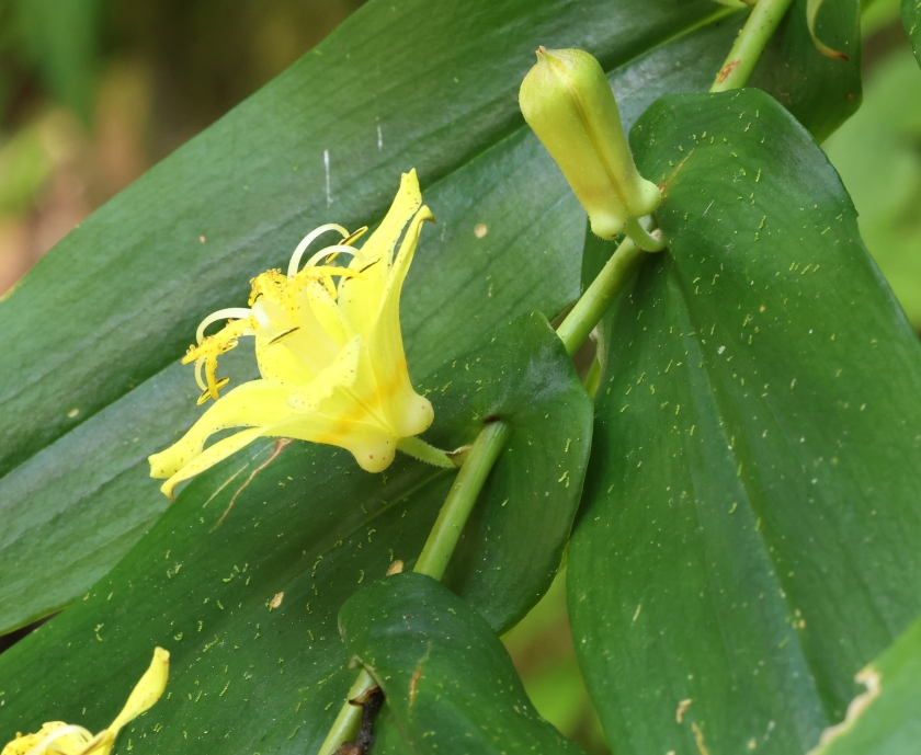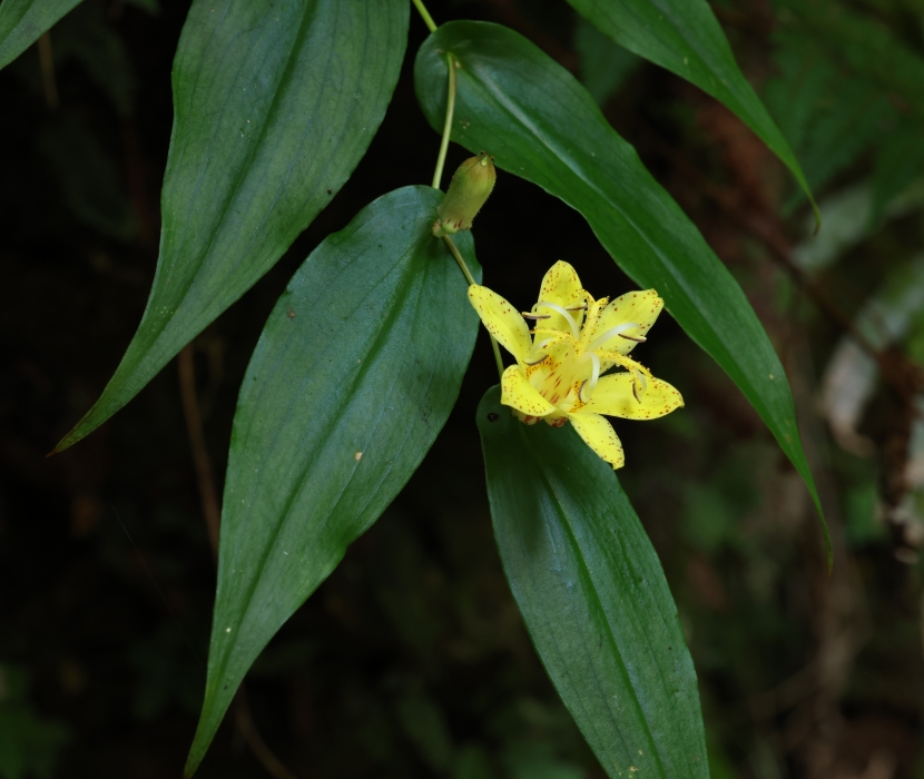 雑感:尾鈴山は非常に硬い岩石である珪長質火成岩類で構成されているため長年の浸食により深い急峻な谷や断崖絶壁をともなう尾鈴山瀑布群とよばれる滝がつくられた。キバナノツキヌキホトトギスは同じ黄色い花を咲かせるキバナノホトトギスやタマガワホトトギスとは大きく形態が異なり、この急峻な谷の湿った崖地の岩場に下垂して自生できるように進化してきた唯一無二のホトトギスの仲間である。そして、渓流沿いの湿った崖地の岩場から下垂して黄色い花をつけた様は幽玄でもある。