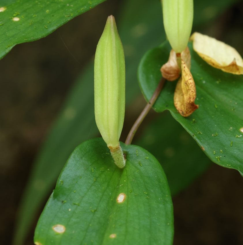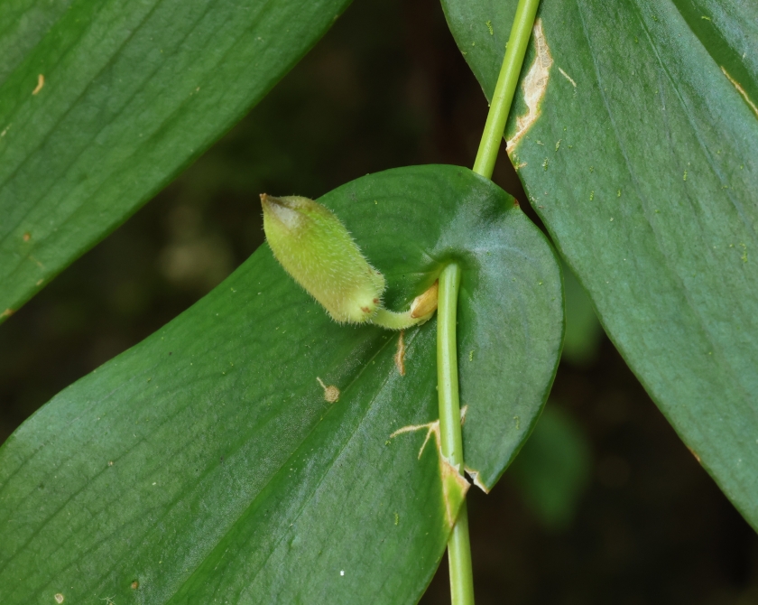 蕾の近接画像。茎は葉の基部を突き抜け、茎には毛はない。蕾や花柄には毛が密生している。葉の基部が茎を巻くのは増水時の葉が茎からちぎれないために進化したとの説もある。
