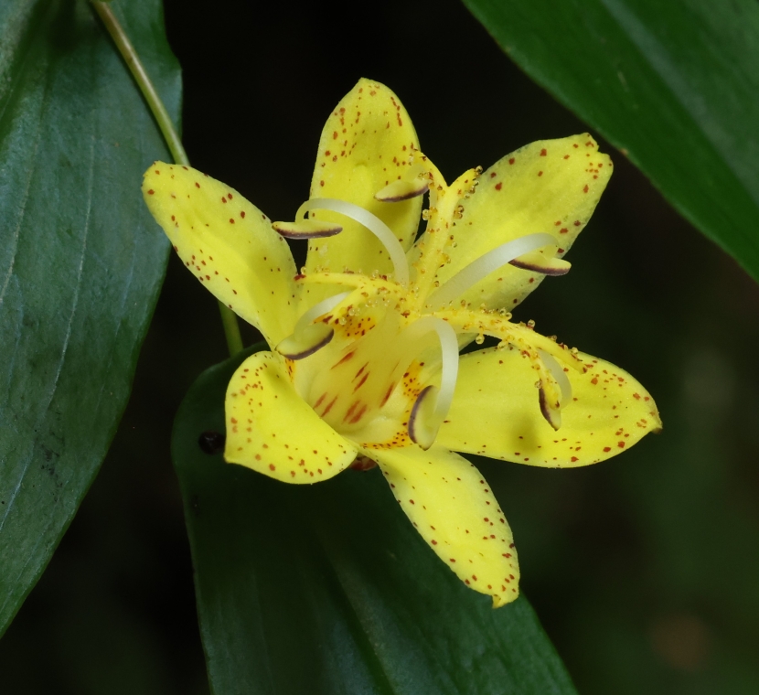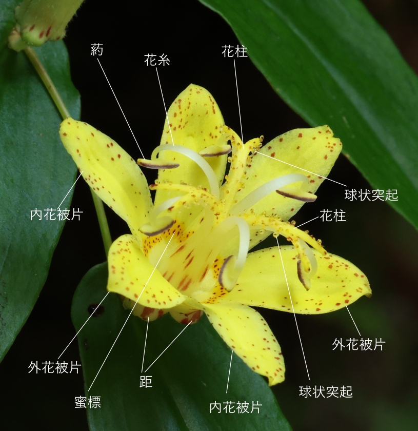 花柄は花よりも短く長さ5~10㎜、腺毛が密生する。花被片は長さ1.3~1.5cm、斜めにやや広く外側に開き、黄色で内面に赤紫色の斑点がある。6個の花糸は花柱を包むように寄りそって束上に立ち