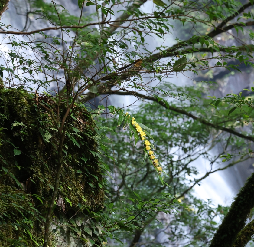 大きな滝の滝つぼに近い崖地に咲く個体。崖地の上部で湿気が少ないため、1株だけのようである。