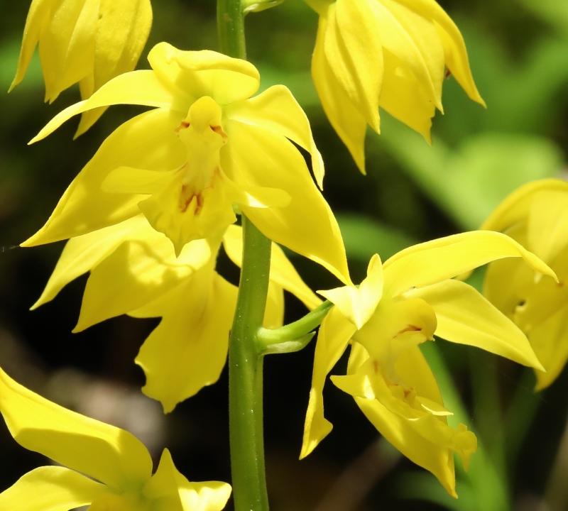 春に偽鱗茎のわきから新たに芽をだして、葉を展開し花茎を伸ばし10個ほどの花をつける。前画像の左端の株の花茎の近接画像で、黄色がきらびやかである。
