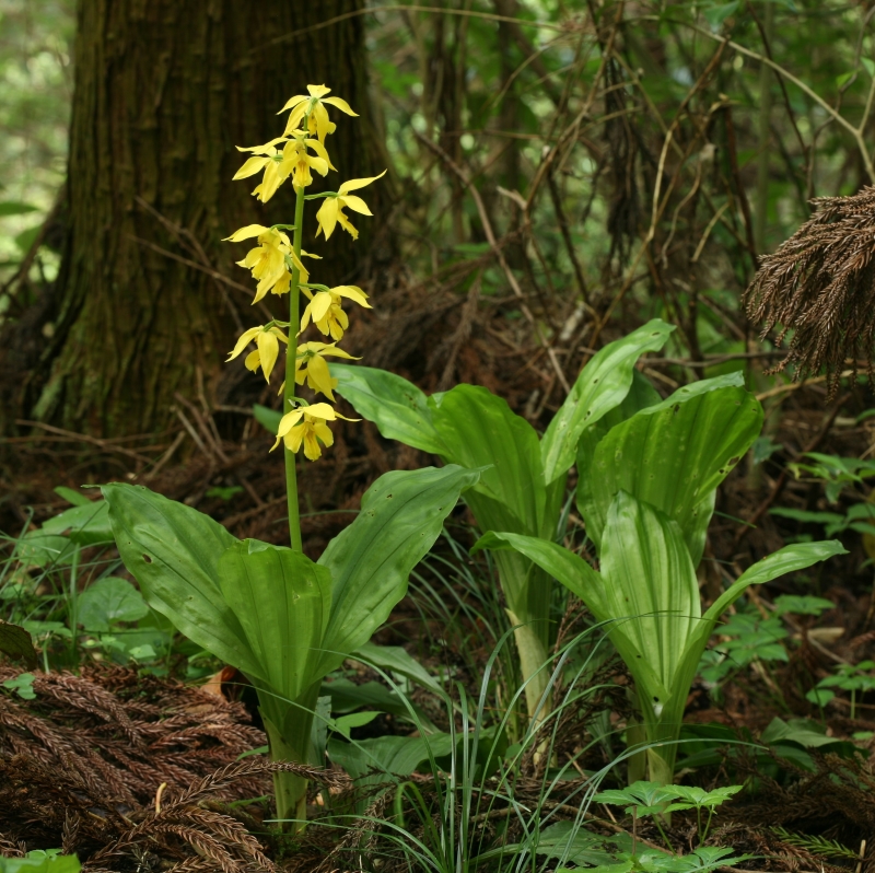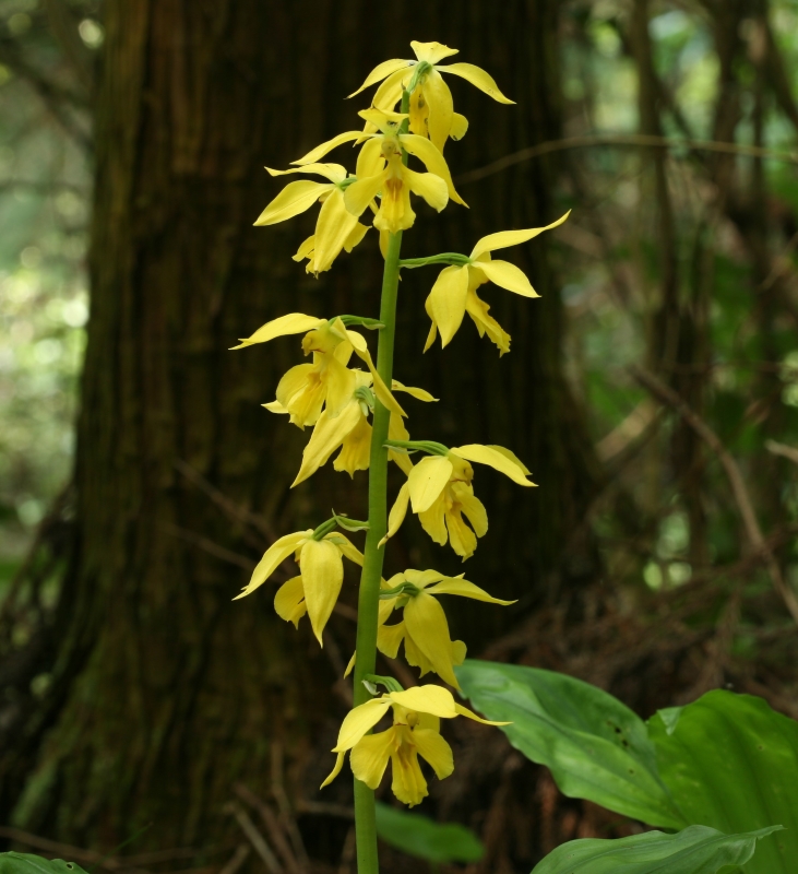 ・特徴 :エビネによく似ているが花は黄色で平開しエビネより大きい。萼片は長さ20~35㎜、幅8~12㎜、側花弁は萼片よりやや小さい。唇弁は深く3裂し中央裂片の上面には3~5条の隆起があり先端はふつうとがる。また、エビネに比べて唇弁の基部の距の長さが5㎜ほどでみじかい。エビネより開花が少し遅く、葉はエビネより大きく長さ40cm、幅9cmほどである。