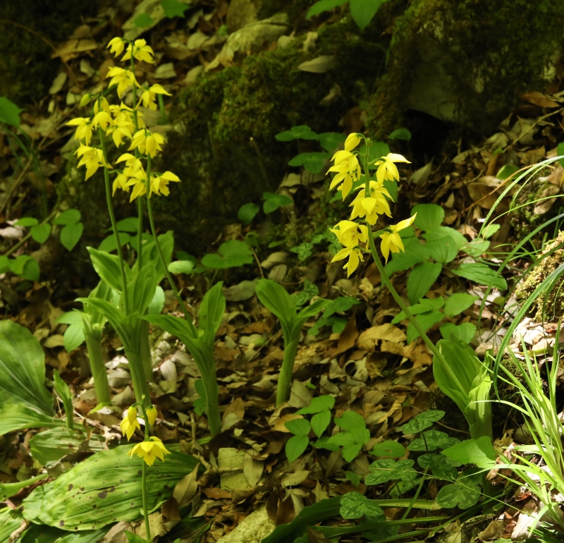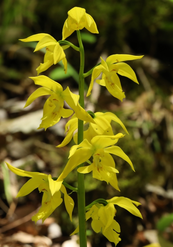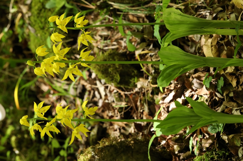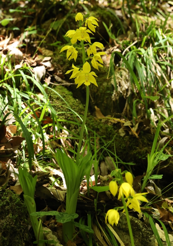 広島県ではキエビネはもともと稀なうえに過去の自生場所も採取され、今知られている自生地も少ない。この場所は石灰岩地の岩場の天然林内でよく採取されずに生き延びていたなと思うほどであった。木漏れ日があたる渓流沿いの岩場で近くにはエビネも自生しており交雑も心配される。
