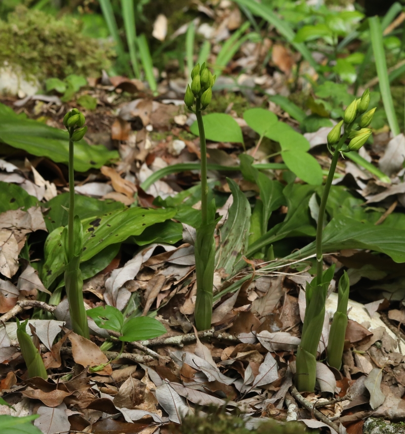 エビネの仲間はスギ林の林床と生育環境が合うのかよく自生しており、この画像もスギ林の林床であった。今から12年ほど前であるため温暖化の影響が少ないためか2024年の帝釈峡の個体にくらべ開花時期が遅いように思われる。