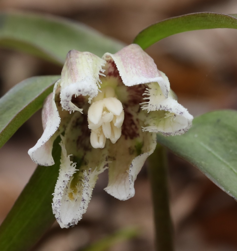 雑感:コシノコバイモは日本産コバイモの中で最も北に生育する種である。草丈や葉の付き方などは他の日本産コバイモと同じであるが、花被片外側の色と内花被片の毛状突起は独特である。