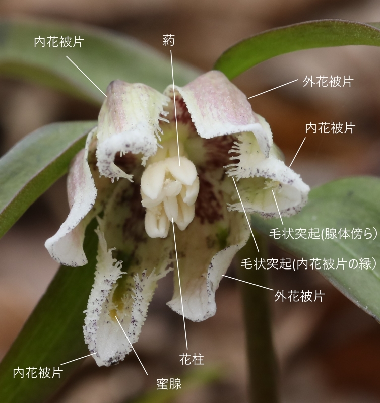 前画像に名称を書き加えたものであるが、ミノコバイモの最大の特徴である内花被片の縁にある毛状突起を示している。このも状突起は花被片内側にある腺体の傍らにもある。