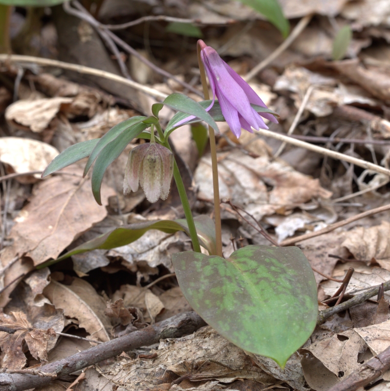 女形のカタクリは日差しがないと開花しないため閉じているが、男形のコシノコバイモは黙って下を向いて咲いているように見えて、ユーモラスである。