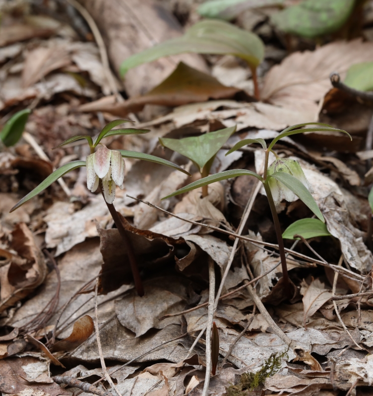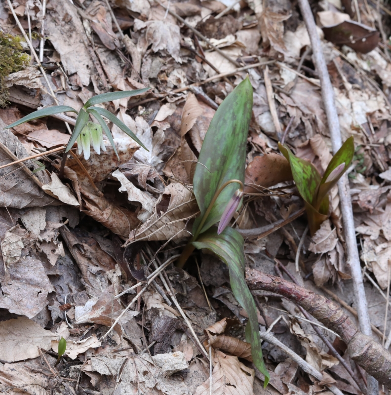 カタクリはまだ蕾であるが、この場所ではコシノコバイモのほうが開花が早いようである。この個体の花被片は淡緑色だけで、紫褐色の斑紋はない。