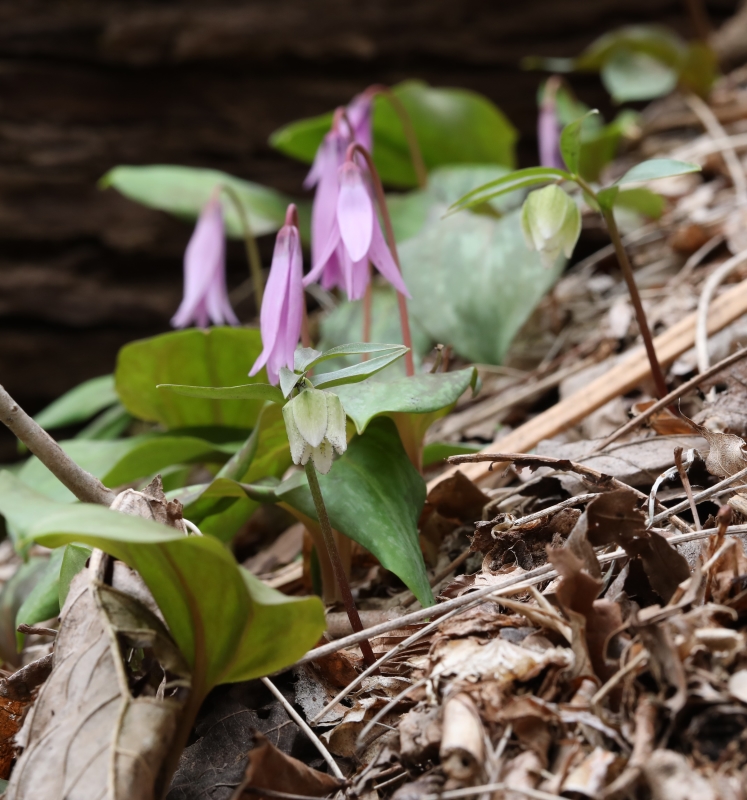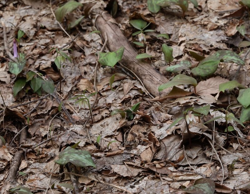 同じスプリングエフェミラルのカタクリの群生も見られた。この個体は斜め横を向いて開花して花被片内側の花柱や葯も見れるが、普通の個体は下を向いて咲き、花被片の内側は見えない。
