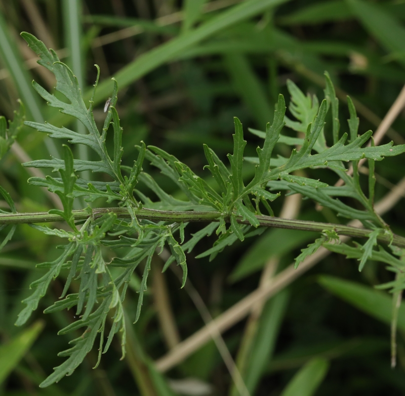 地上茎の中ほどの画像であるが、木質化した茎は剛性があり曲がりにくい。葉は葉柄はなく羽状深裂し裂片はおよそ4対以上欠刻がある。