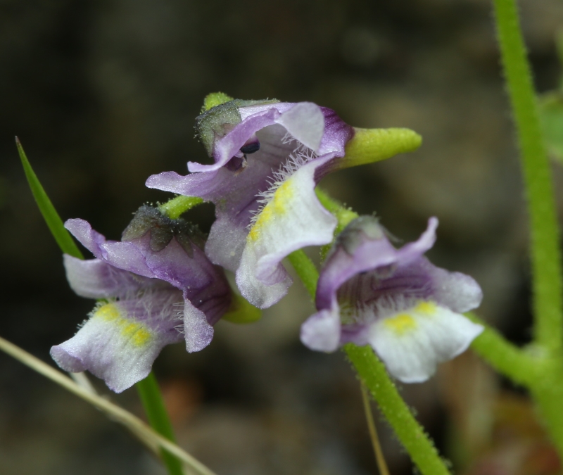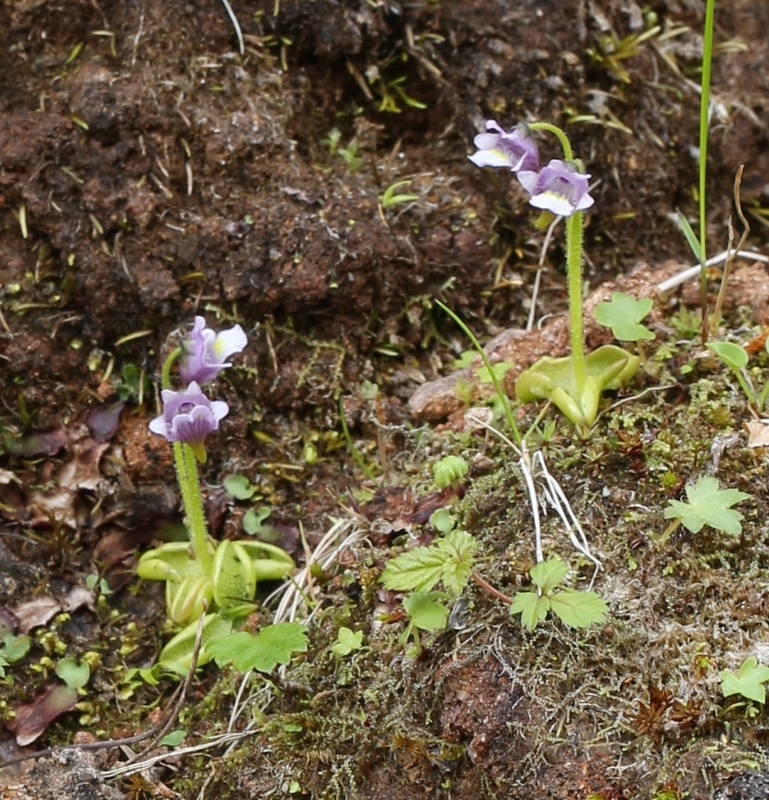 ・特徴 :同属のムシトリスミレのほうが見る機会が多いが、本種は草体が一回り小形で、主に岩崖に自生し、花の色がやや薄く、花茎がしばしば二股に分岐する点が相違点といわれる。湿った岩崖にくっついて生える多年草で、