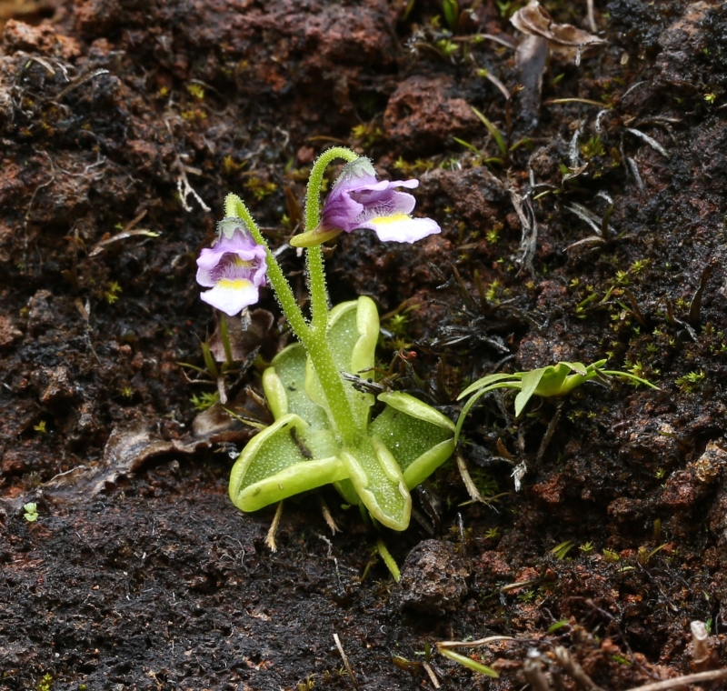 花茎を1本だけ伸ばし、途中で二股に分枝して、淡紫色の花を2個付けている。内側に巻いた葉の表面と花茎には腺毛が密生しているのがわかるが、食虫植物の証である。