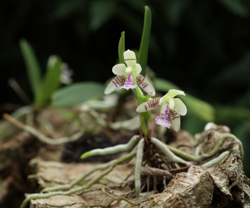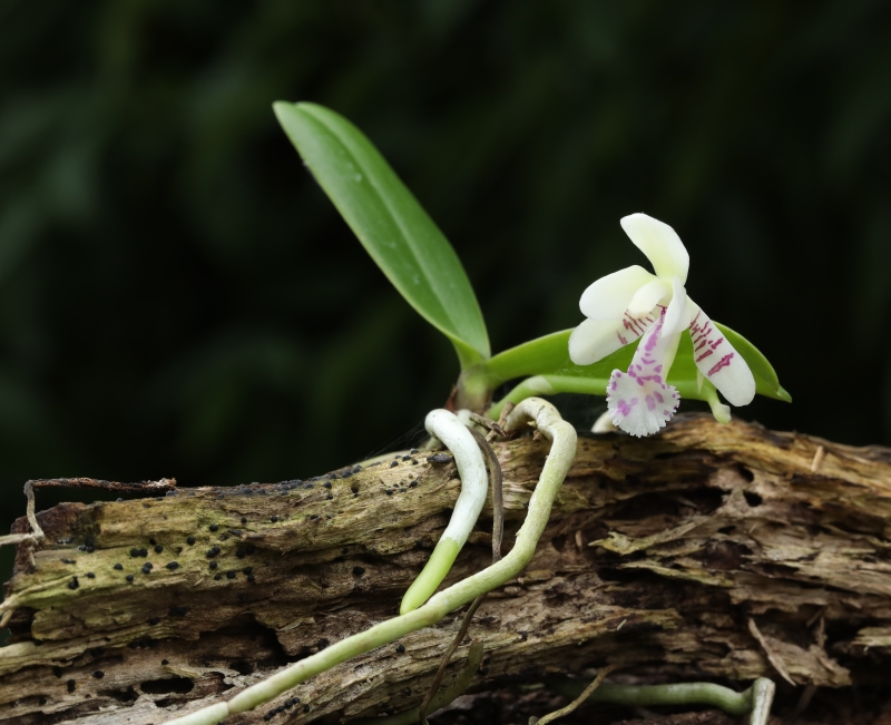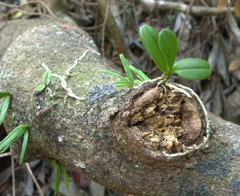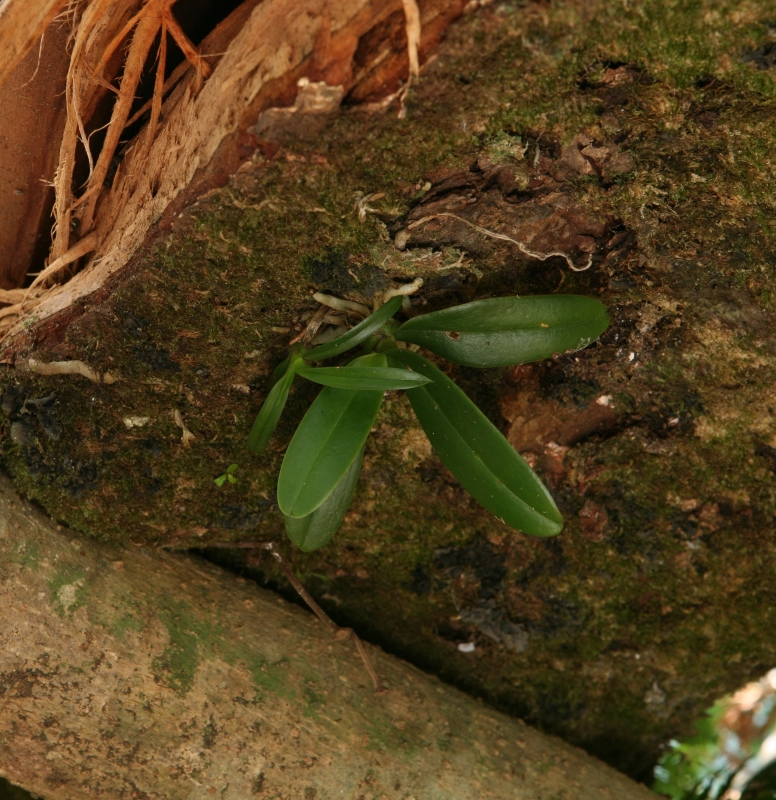 枯死した倒木の樹幹に着生して開花している個体。葉が2枚しかない子株であるため花の数は少なく2個である。