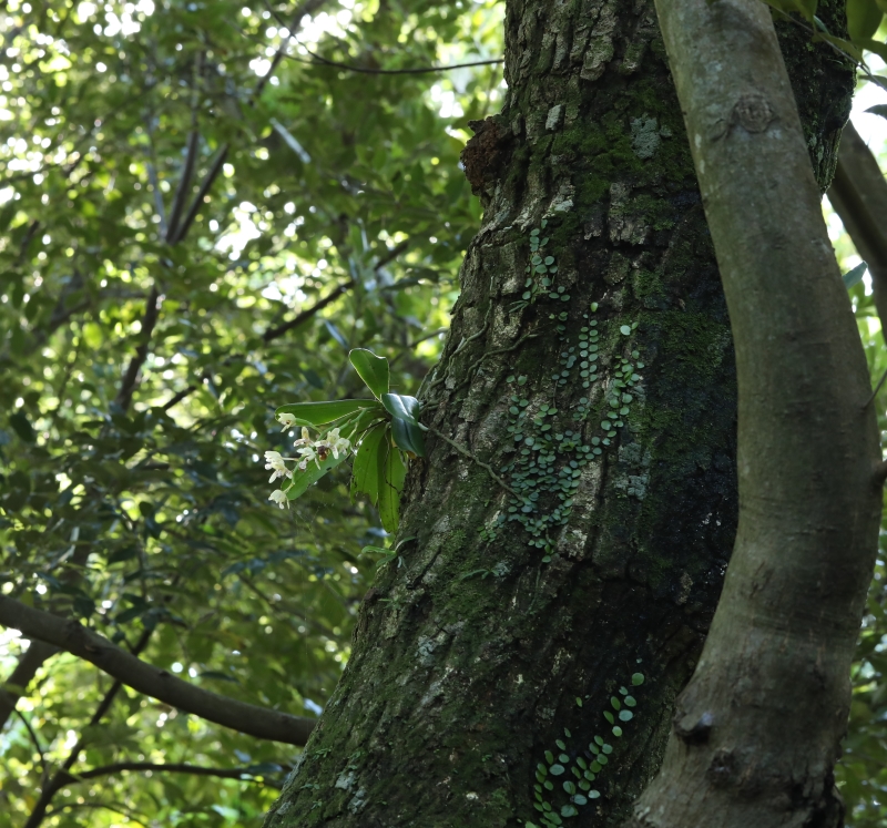 前画像の全体像で、生育環境は谷川沿いの照葉樹の原生林の胸高直径40cmほどのスダジイの地上から約5mほどの樹幹に着生して開花していた。樹幹にはマメヅタの他にナゴランの子株も2個着生していた。