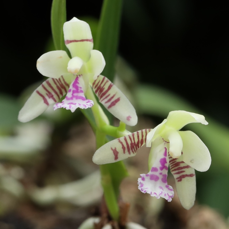 前画像の花の部分を拡大した画像である。花茎は茎の下部の葉腋から伸びて花を2個つけている。花は径約2cm、少し緑がかったクリーム色で花被片は斜めに開き長楕円形の鈍頭である。外花被片(側萼片)の内面基部には淡紫褐色の横縞が入る。唇弁は倒卵形で先端は丸く、櫛歯状に波打ち、赤紫色の斑点が入る。唇弁の基部は蕊柱の下で節になってつながる。唇弁の距は嘴状に前方に向くが、この画像では唇弁の下に隠れて見えない。蕊柱は前方にやや曲がり長さ12㎜、突出した小嘴体が目立つ。