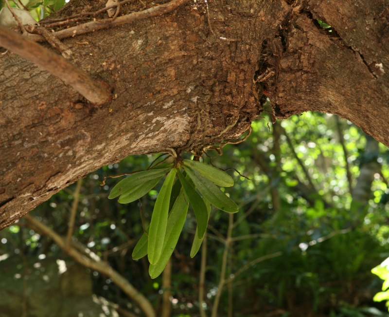スダジイなどの大木の樹幹の高所に着生しているため、触れられる距離でみられるのは倒木に着生している個体しかない。倒木の地上2mほどの位置に着生していた個体で花期でないため葉だけである。