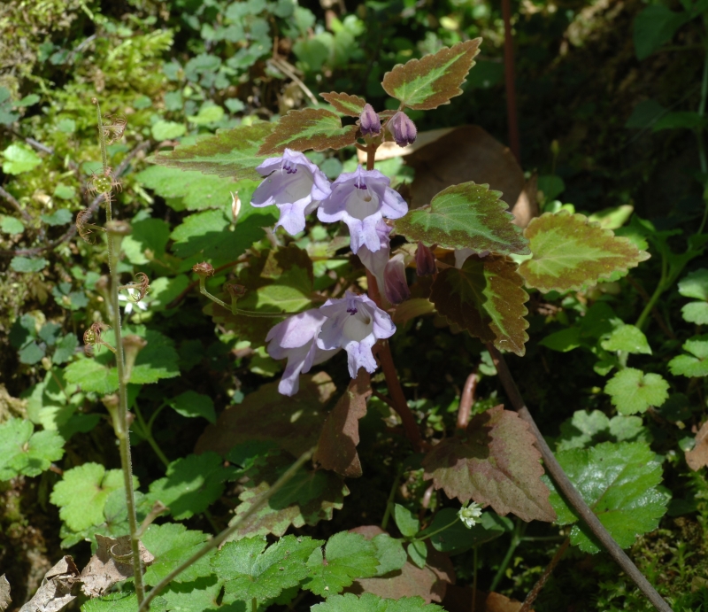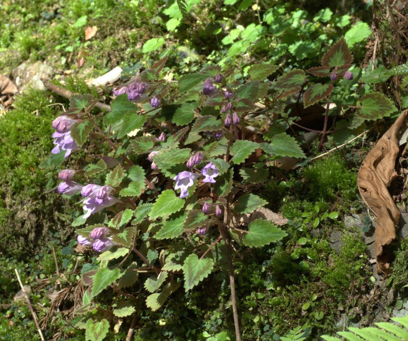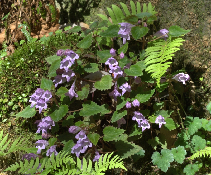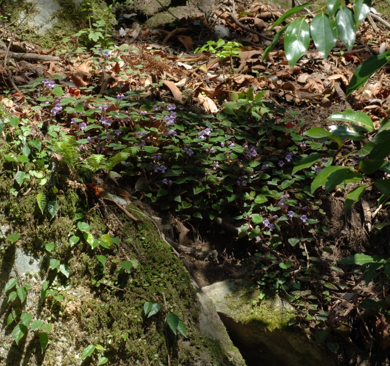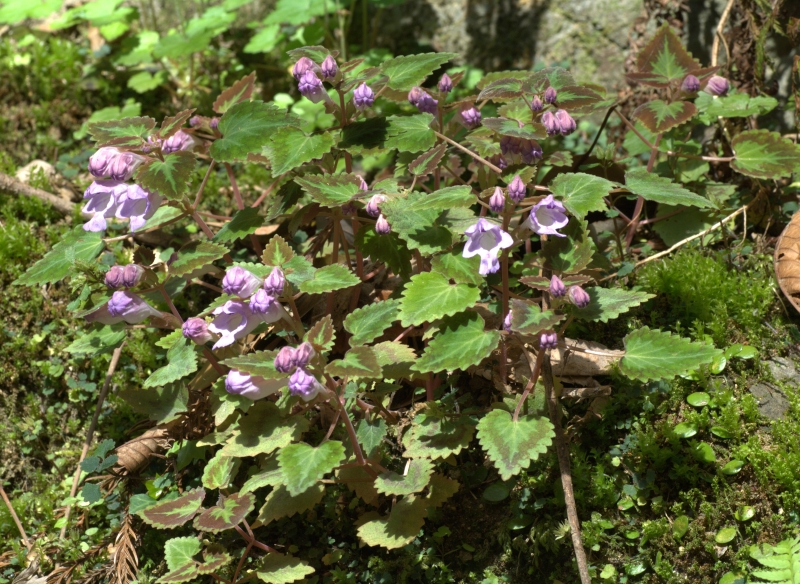前画像の花の近接画像。花は葉腋につき大きく空いた下唇の喉部には開出毛はみられない。ラショウモンカズラの花よりこじんまりとして上品である。