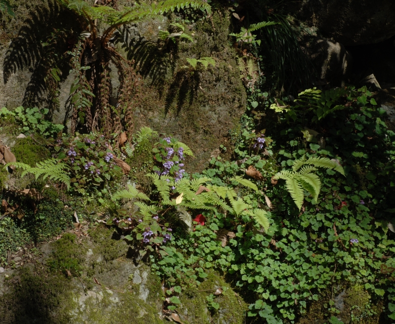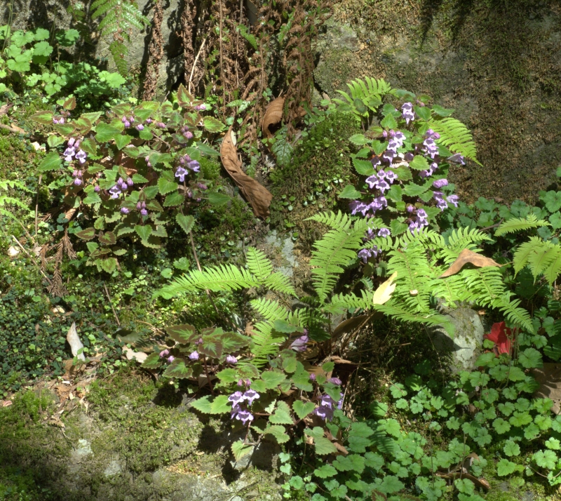 谷筋の崖地でイノデの仲間、ジュウモンジシダやコチャルメルソウなどとともに生育している。