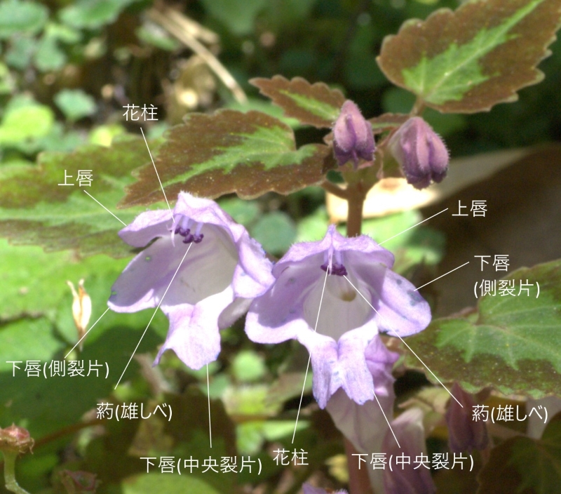 雄しべは4本、花柱の先の柱頭は2裂する。上唇は短く2裂、下唇は3裂し側裂片は横に張り出し、中央裂片は前に突き出して先は2浅裂している。