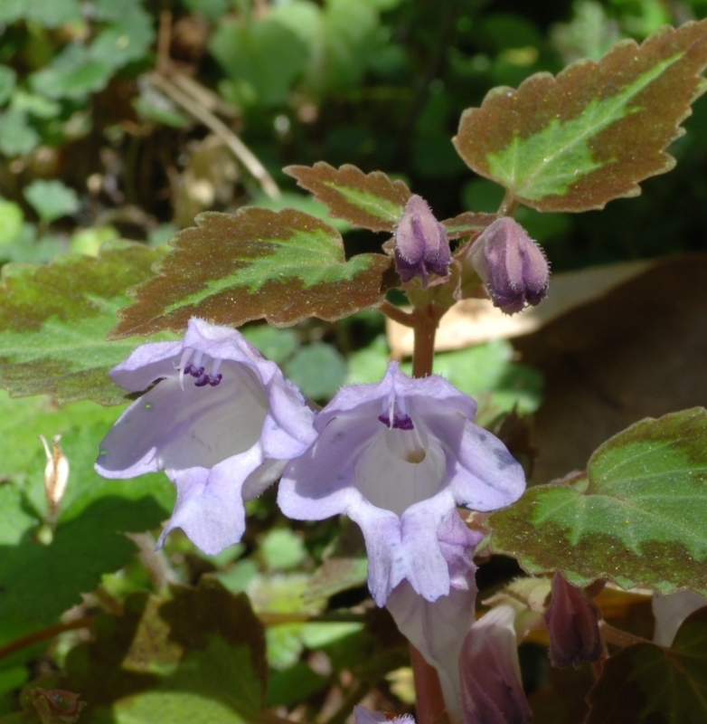 葉の表面は緑色であるが、しばしば褐色の模様が入り、葉裏はふつうは紅紫色をおびる。萼は筒状鐘形で長さ1cmほどである。花冠は淡紫色で筒状、長さ約4cm、開口部は広がって上唇と下唇に