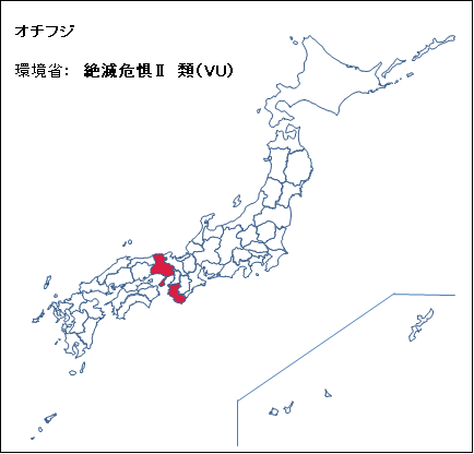 雑感:オチフジは葉の紋様と紫色の花の組み合わせが絶妙で魅かれたが、2006年に初めて見た当時から播磨地方と高野山しか生育していないことが気になっていた。トベラ科のコヤスノキも播磨であるが、古刹の境内・社叢でなんとなく、僧侶関係で中国からの古い時代の帰化であろうと推論したが、オチフジは高野山由来で、現在は播磨の自然度の高い山地林内しか生育していない。しかし、