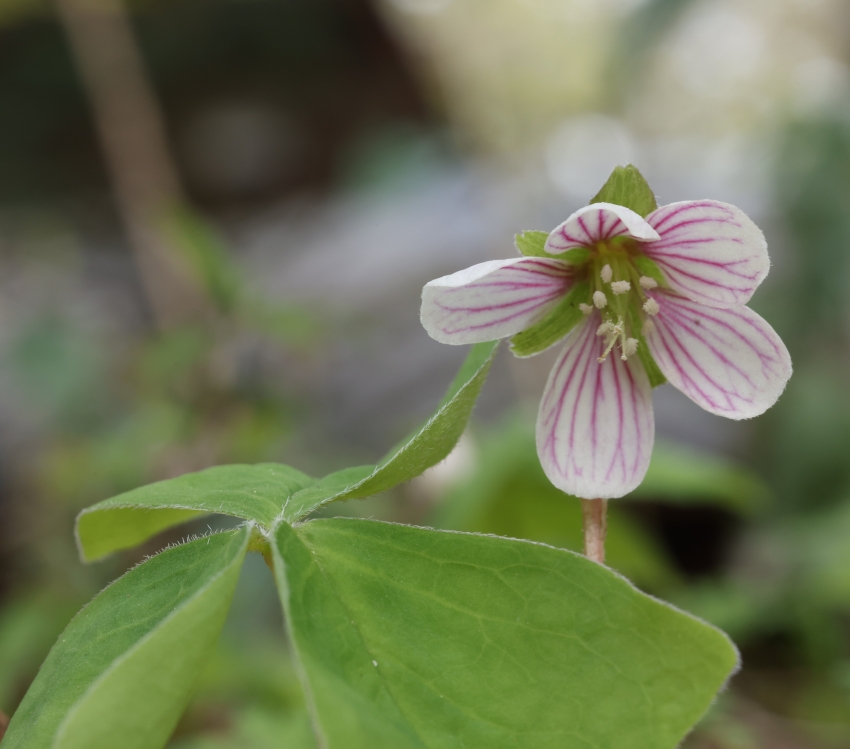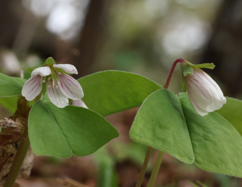 花茎は葉が開くよりも早く伸びる。苞は花の下につく。花は下向き、またはやや横向きに咲き、直径2.5~3cm、花弁は白色で紅紫色の脈が入る。蒴果。ミヤマカタバミやコミヤマカタバミとは