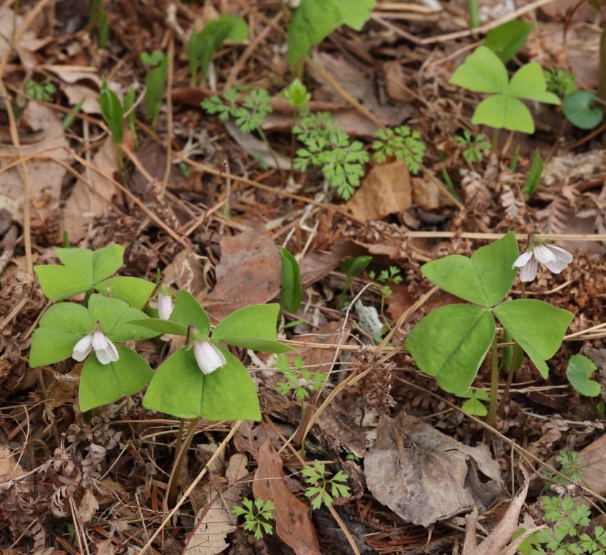 オオヤマカタバミには出会えなかった。その後、桐生市の鳴神山のスギ林で、葉ばかりの個体が多いなかで、花を咲かせた個体があり、奥ゆかしく下を向き赤い筋の入った花弁を見て、うなずいた記憶がある。