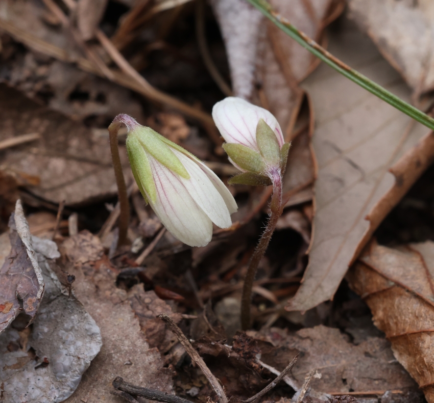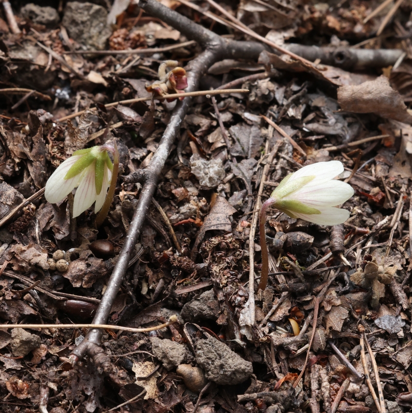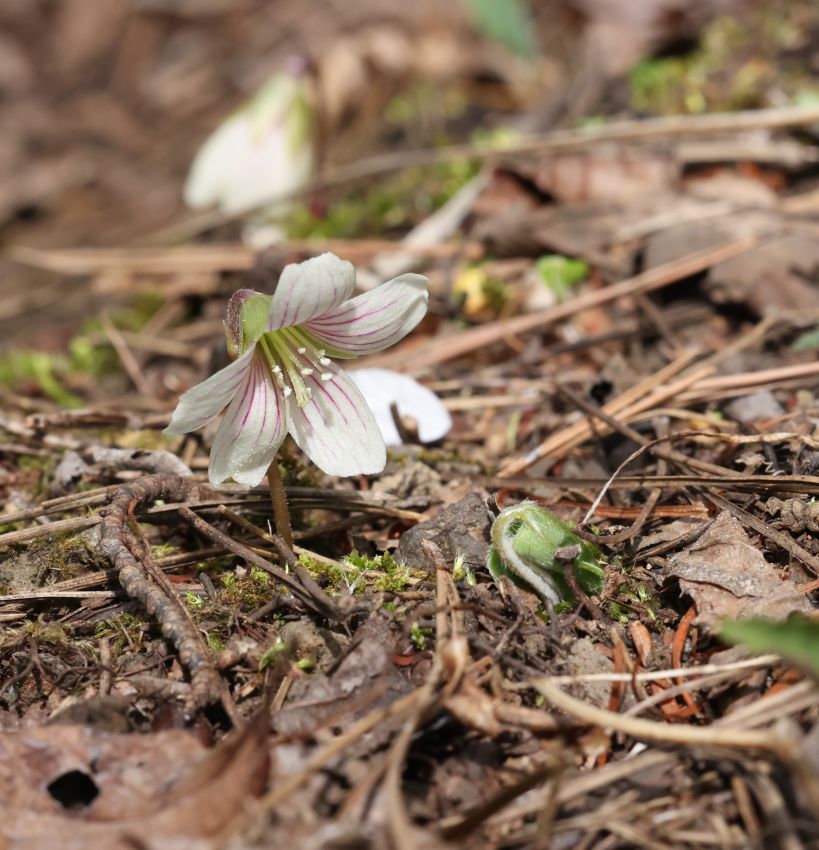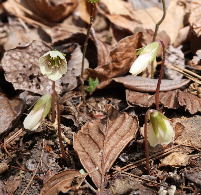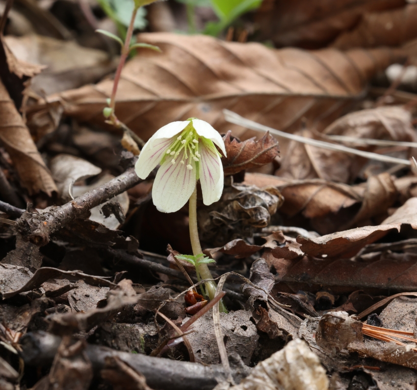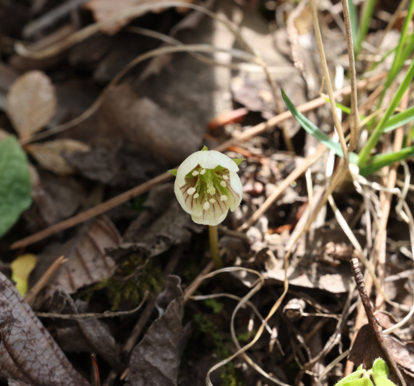 花茎の高さ約5cmの開花したばかりの個体。花の形状はコバイモ類を連想させられる。花茎が伸びないのは、この場所が明るく日当たりの良いためで、他のスギ林の林床のような日陰の個体は