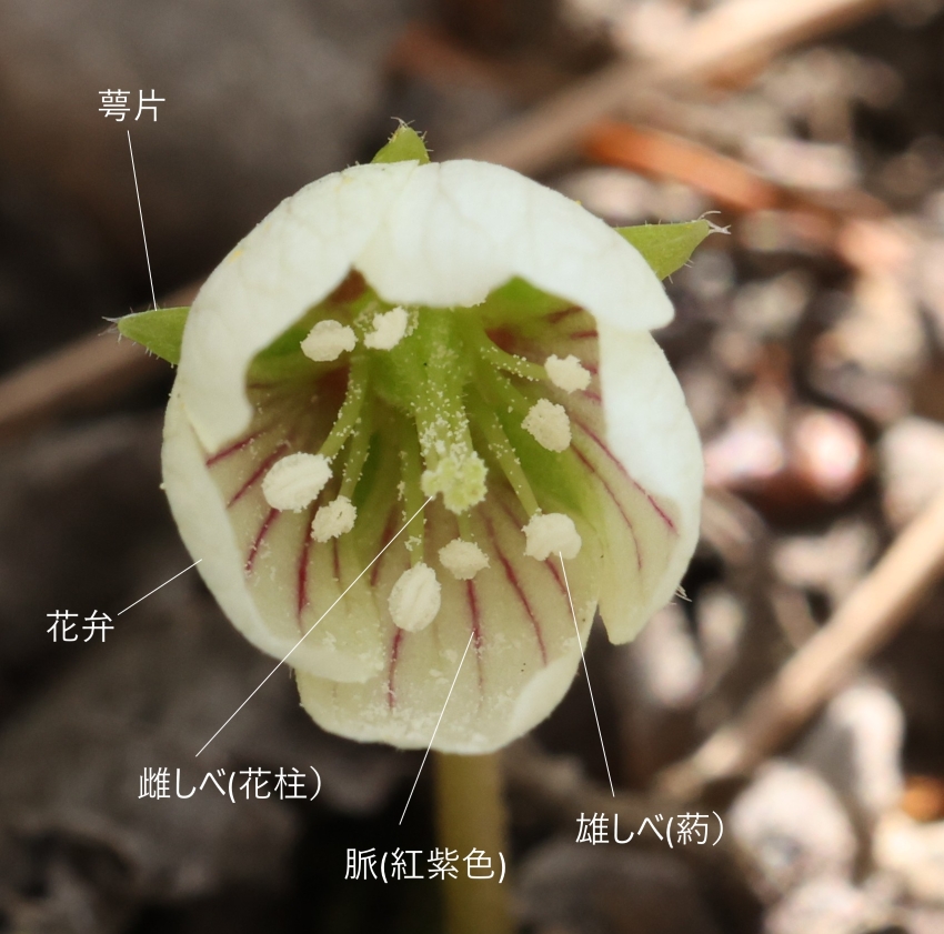 花茎が地上に出て開花したばかりの斜め下方向に咲いた花。咲き始めの花弁はふつうは平開せずに閉じ気味に咲く。早春の高地であり、霜や冷気から雌しべや雄しべを守るためのようである。