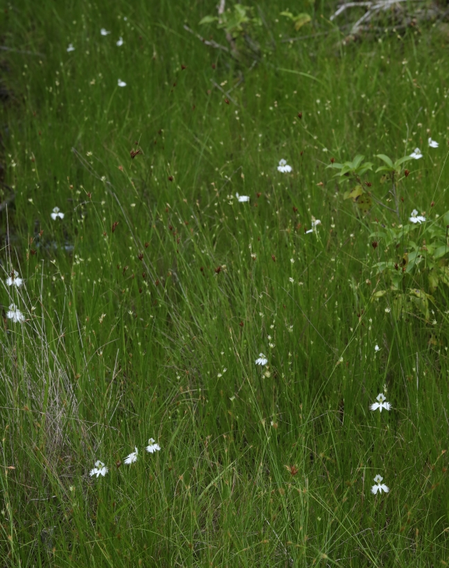 自生地では群生といっても、この程度の点在が普通であり、背丈が低いサギソウは湿地内で、他の植物との生存競争に苦労しているようである。