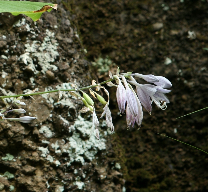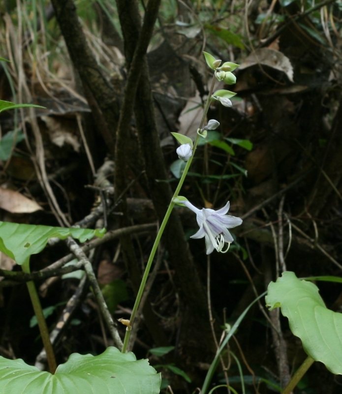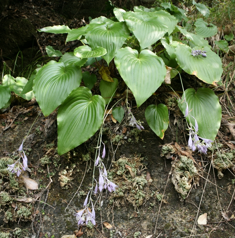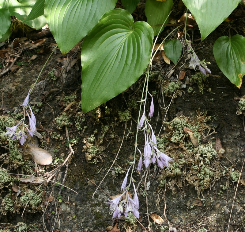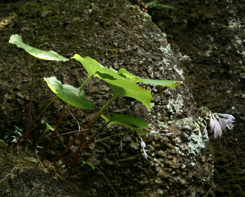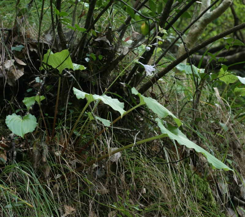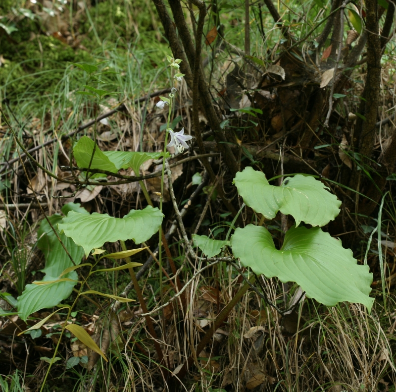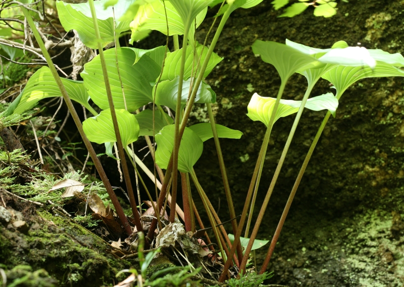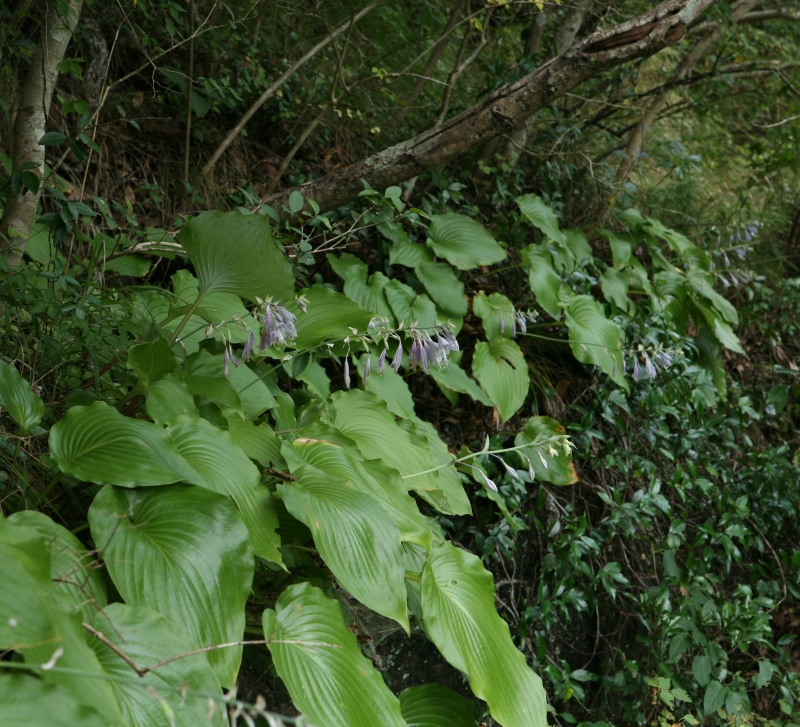 さびしいが本筋なのであろう。ギボウシの仲間の分類は迷うことばかりであるが、その点、本種は生育場所、葉の裏の粉白、花被の内側の脈の淡紫色の着色、葉柄の特徴などわかりやすい。