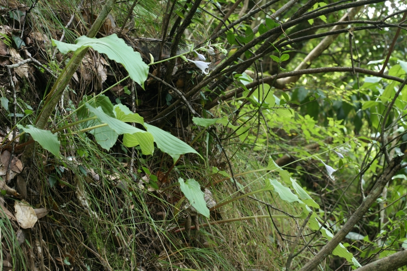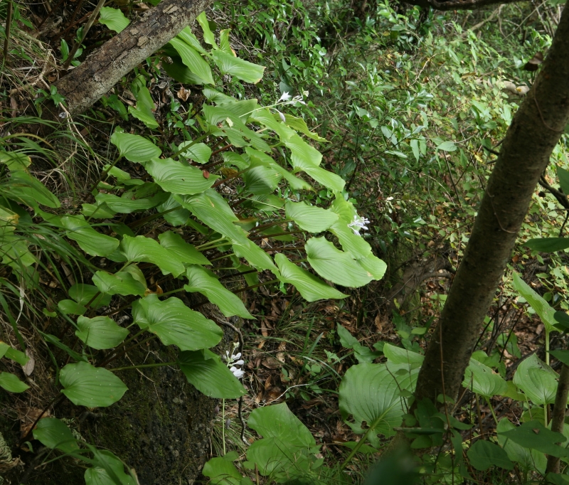 標準的な個体の全体像。半日蔭の谷間の斜面に生育する個体。4個の葉が根出、直立し1個の細い花茎をのばし、複数個の花をつけ最下部の花が開花している。