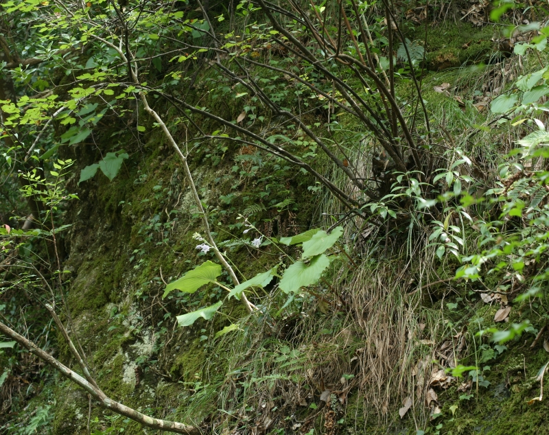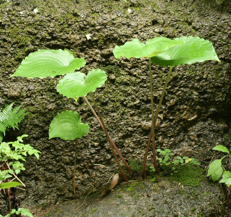 崖地の岩の隙間の個体。葉柄は約20cmでやや細く基部から中部まで紫褐色を帯びる。葉は広卵形、基部は心形、質は厚い。
