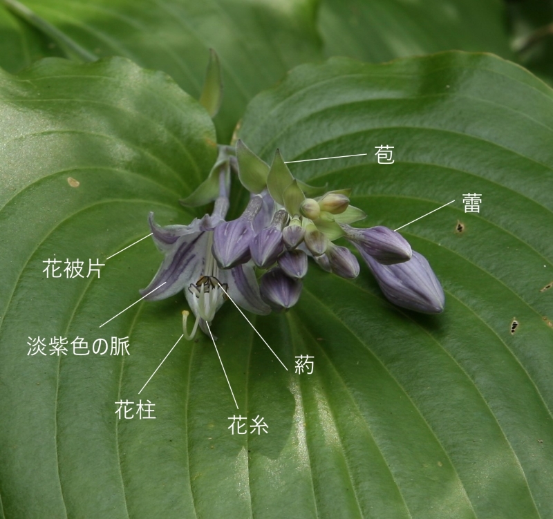 ギボウシ属の特徴である花被片は6個、雄しべは6個で花筒の外に出ている。花糸の先の葯は丁字形につき、花柱は一個で花糸とほぼ同じ長さである。