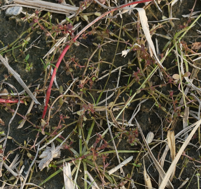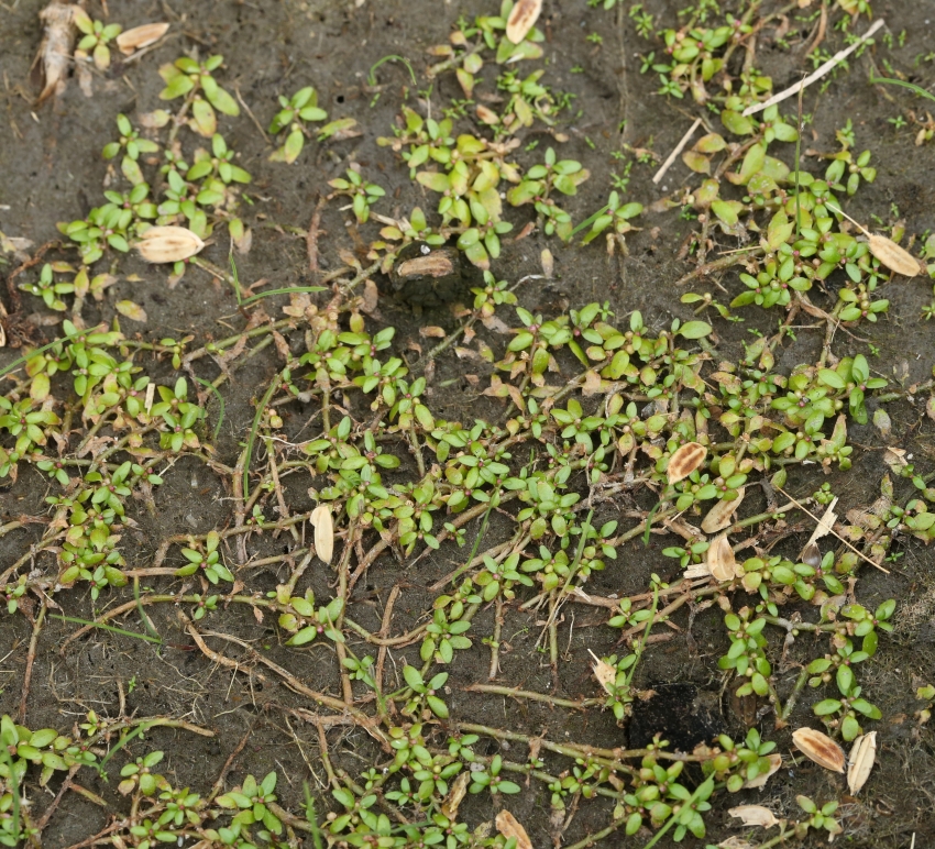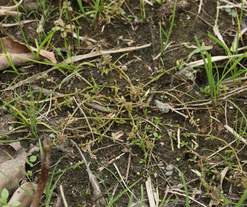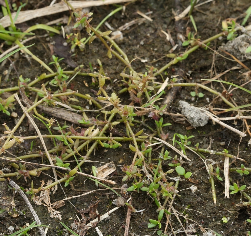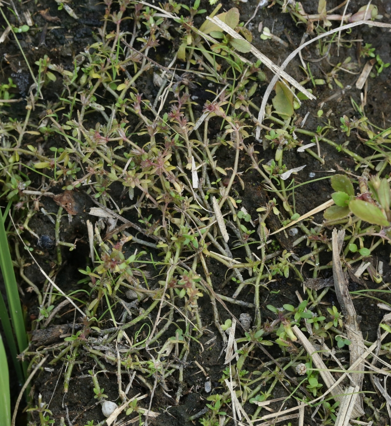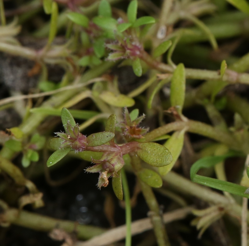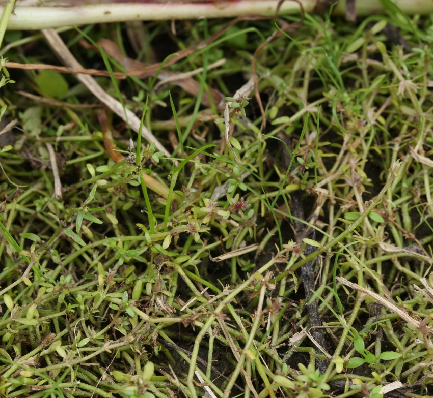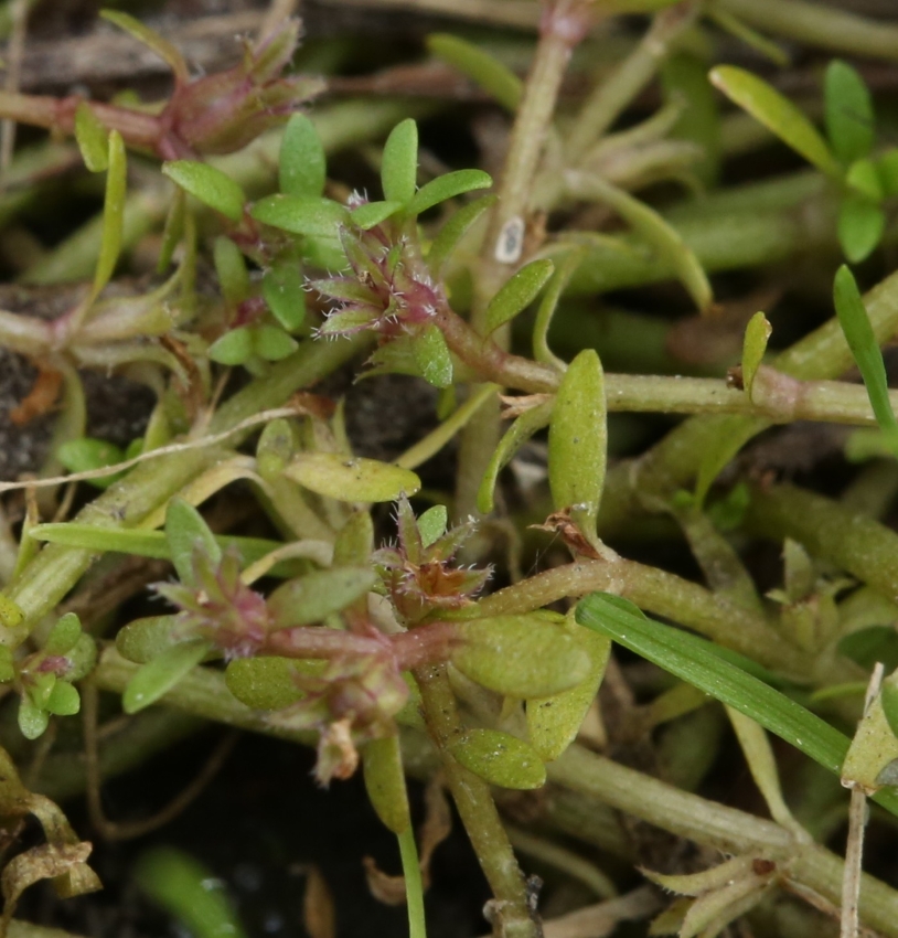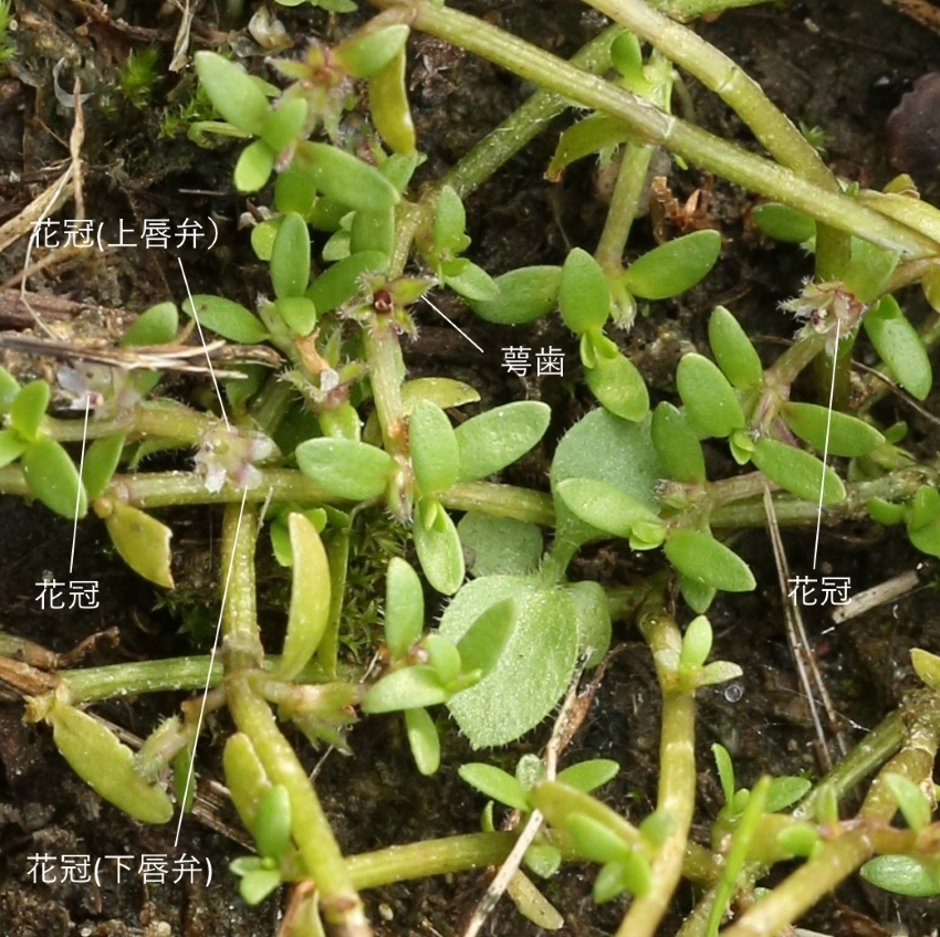 ・特徴 :1年草。茎は細く無毛で、匍匐し多数分枝する。葉は小形で対生、無柄で基部は茎を抱き狭楕円形~広線形、長さ2~5㎜、幅1~2mm、全縁でやや厚い。花は無柄で葉腋に1個ずつつく。