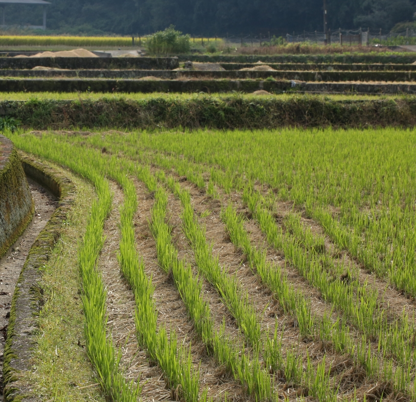 手前の規則正しく並んだ稲の株から稲刈りのあと20cmほどの葉が伸びている水田がスズメノハコベの生育地である。水田の中央部には少なく、左側水路との縁や上方の水田の石垣との境界付近に多く見られる。