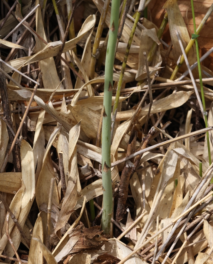 ササ原の中を通るけもの道に面して生えている個体で、地上茎の下部から先端までの草姿がわかる。4個の地上茎があるが、4個すべて地下茎でつながった1個の株とおもわれる。