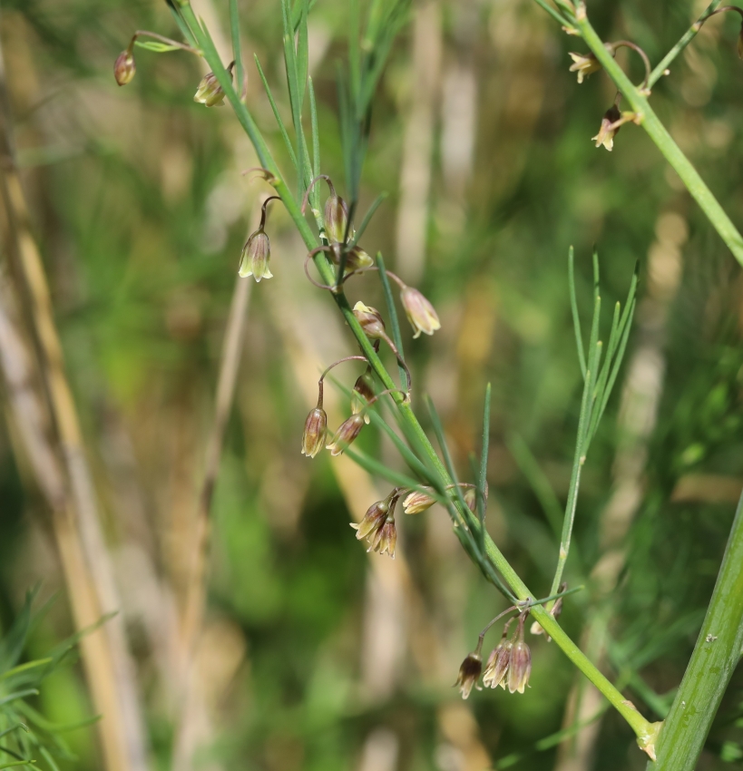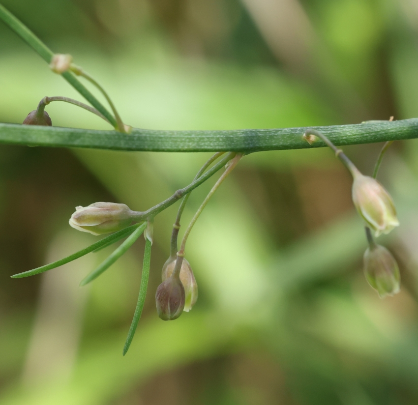 そのわきから針葉に似た長さ1~3cmの葉状枝を1~6個だす。花柄は長さ6~10㎜で中央部付近に関節がある。花は雌雄異株で、釣り鐘状の花が下を向いて咲き、下半分が紫褐色、先の方は淡黄緑色。雄花の花被片は長さ約7mm、