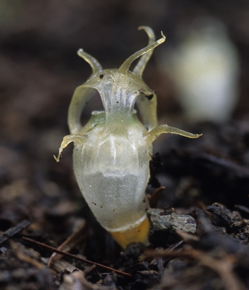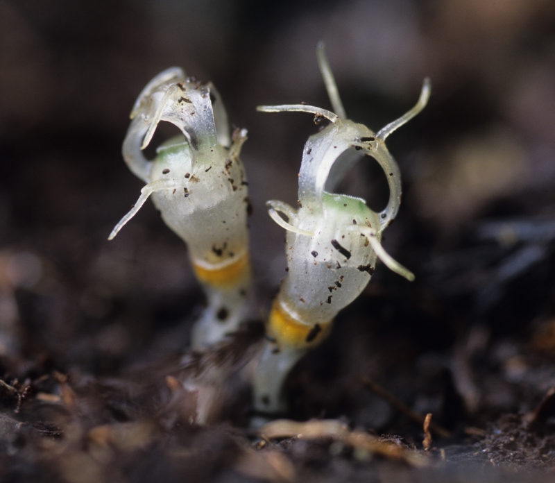 ・特徴 :菌従属栄養植物の多年草。根茎は糸状で地中を長く這い分枝して、節に長さ1~4cmの花茎をつける。地上に出た花茎には数個の半透明の鱗片葉をつける。