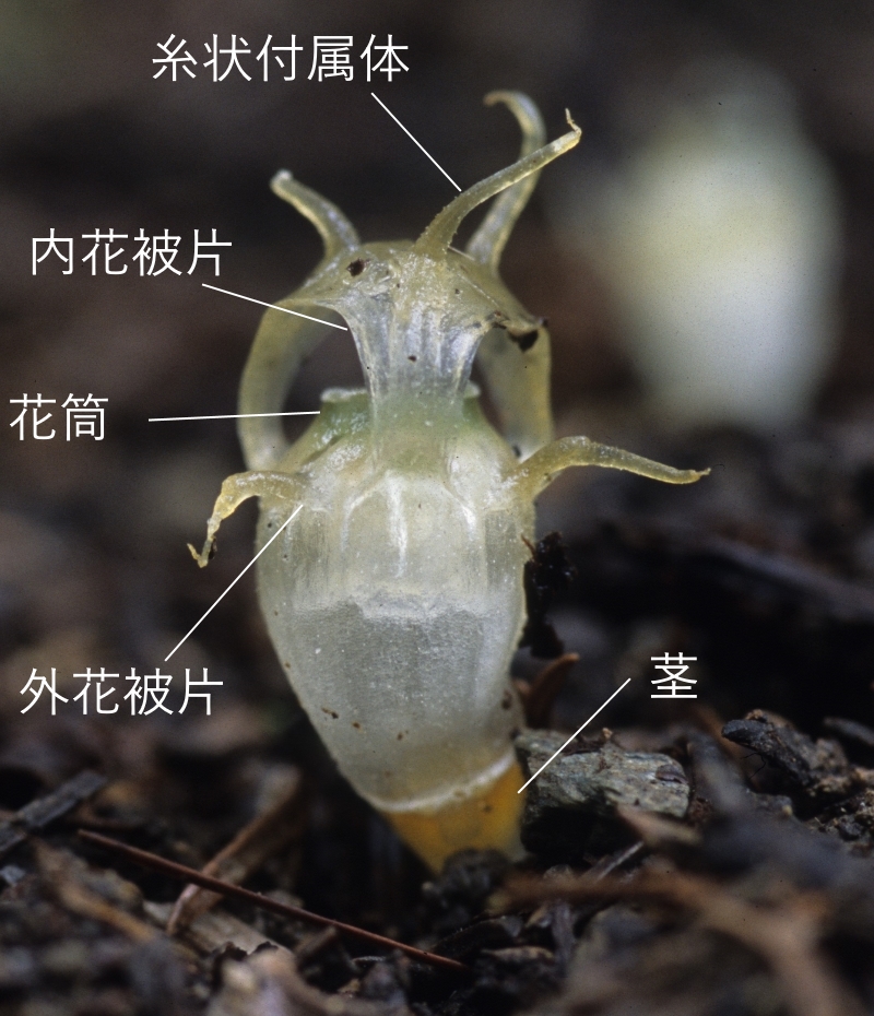内花被片と外花被片はどちらも3個あり、それぞれに糸状付属体(線状突起)がある。