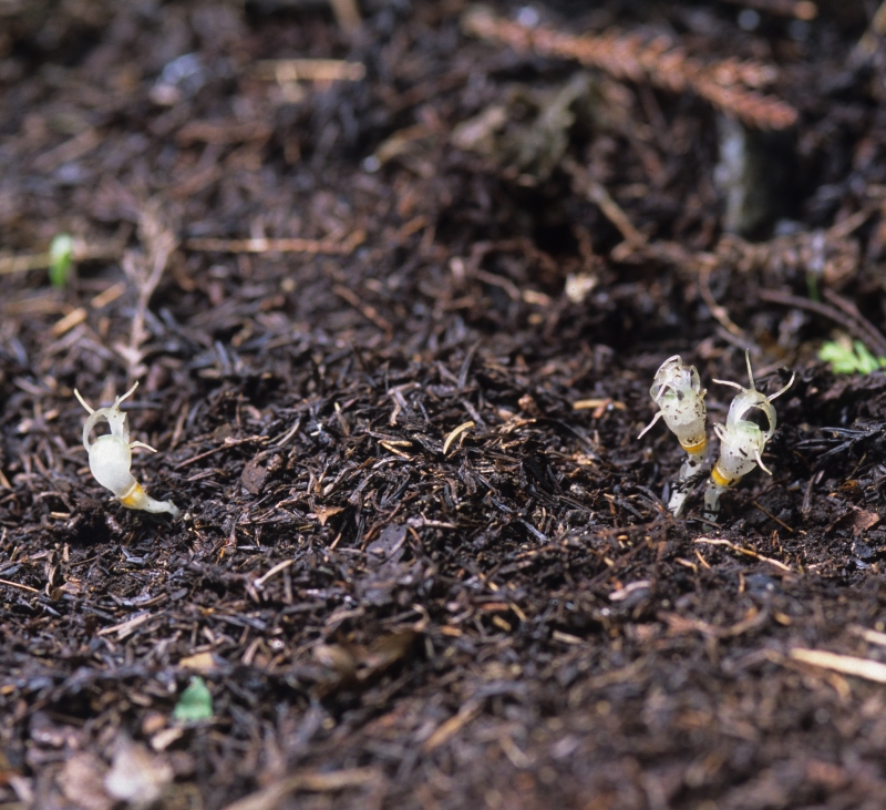 茎に葉緑体のない半透明の白色の葉がわかる。