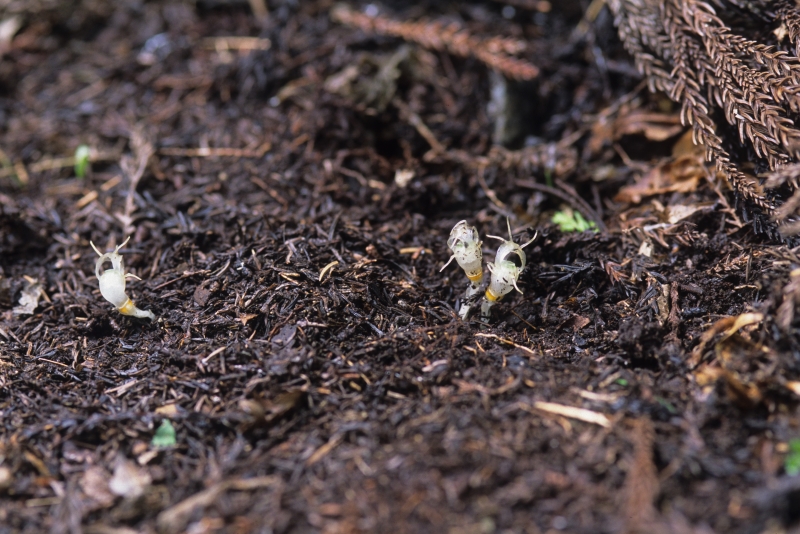 落ち葉が朽ちた腐葉土の中を根茎が長く這い分枝し、その節から花茎を出したもので、3個体共に同じ根茎と考えられる。また、全体像を確認するために