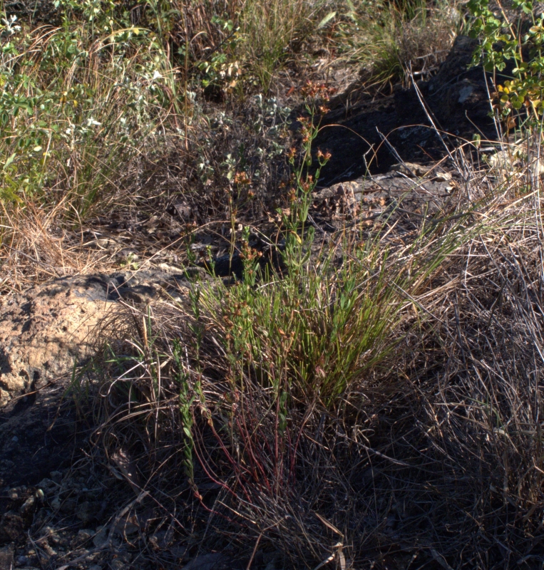 株立ちした個体、最長の花茎は約50cm。茎が細く茎頂や上部の枝の先に集散状の花序をつけている。葉は対生して小さい。