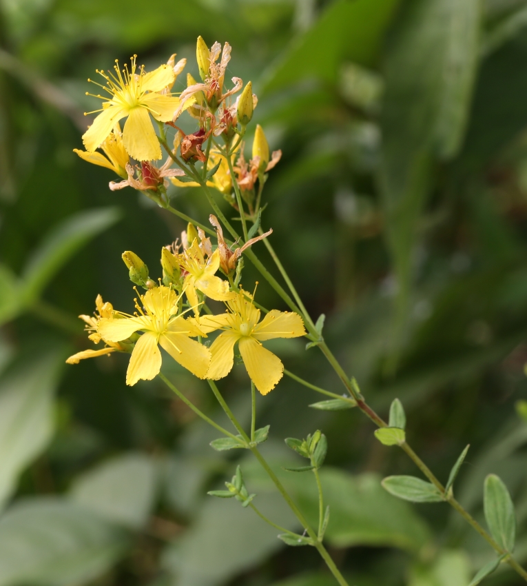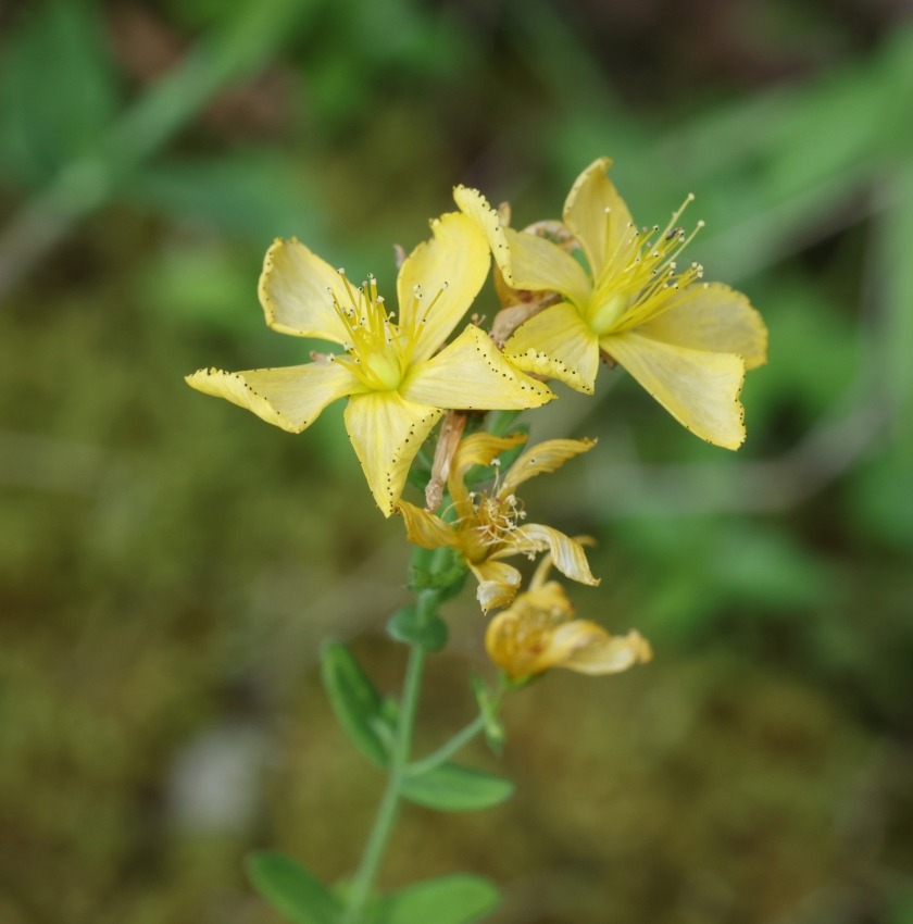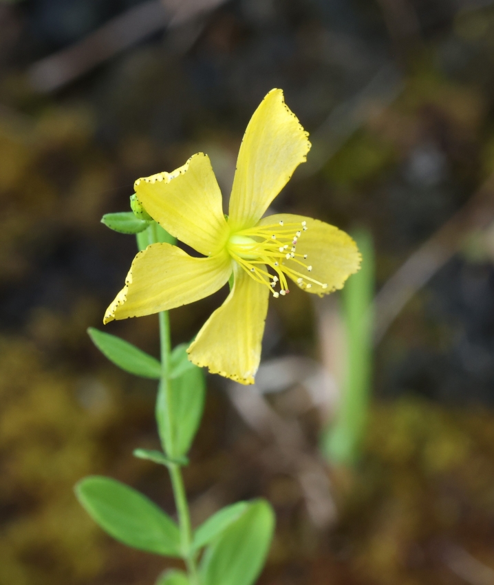 単生した個体の茎頂に咲いた個体。花の径は15~18㎜、花弁は5個、倒卵状楕円形で先端がトモエソウのように曲がり辺縁は波状縁となり黒点がある。雄しべの先の葯の黒点がよくわかる。